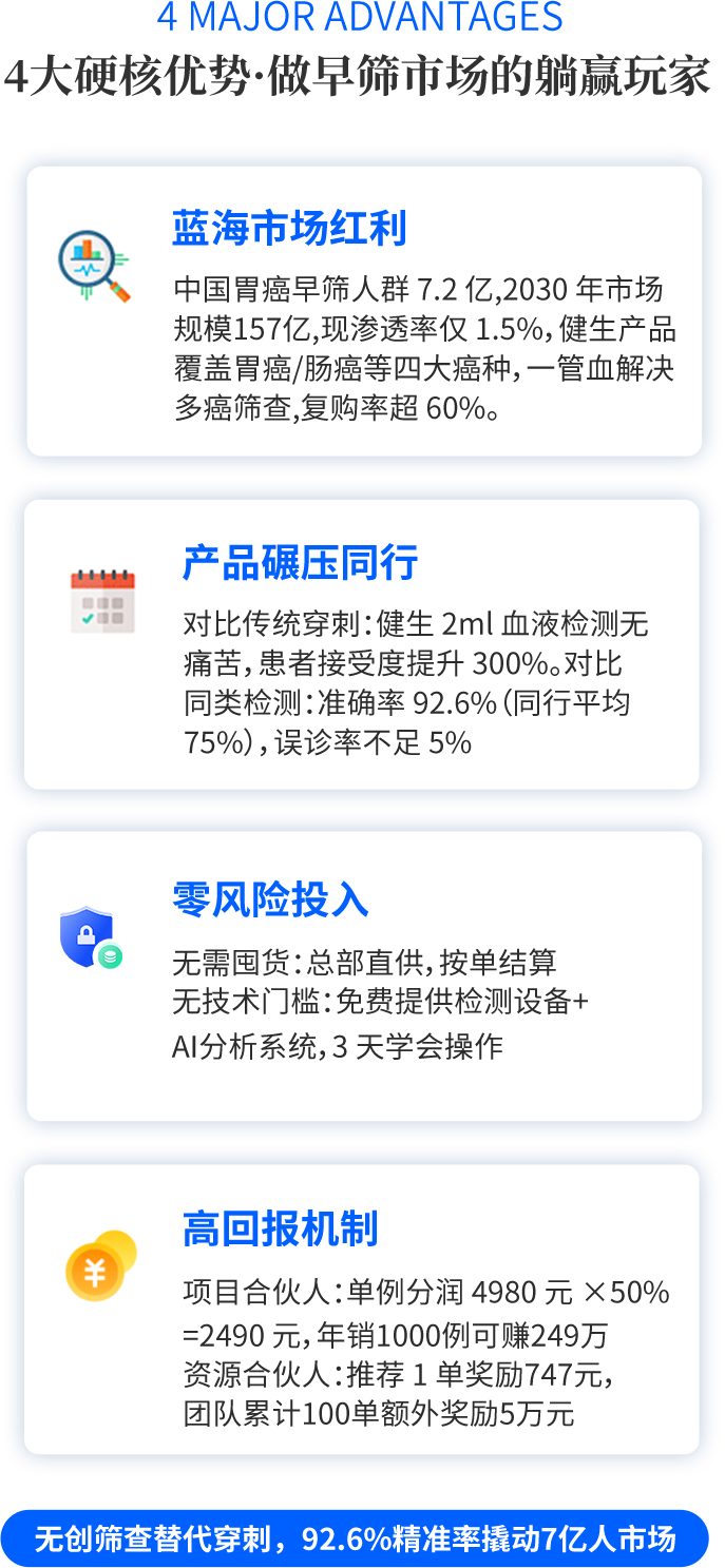 健生公司聘請了多名海外華人教授,引進美籍華人科學家王家旺教授共同研發打造miRNA早期診斷惡性腫瘤產品。利用miRNA分子診斷惡性腫瘤核心技術,研發轉化胃癌診斷、腸癌診斷、肺癌診斷等覆蓋全癌種的早診早篩分子診斷惡性腫瘤產品。